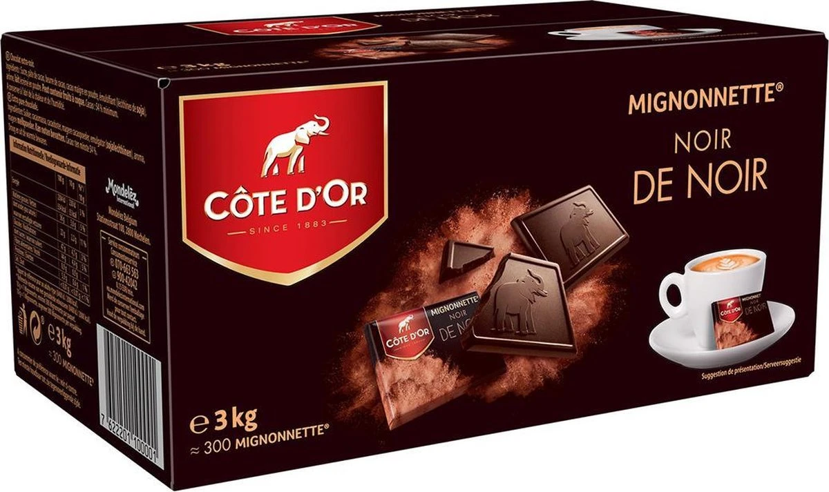 Een doos gevuld met 300 kleine pure chocolade tabletten van telkens 10g van C么te d鈥橭r.