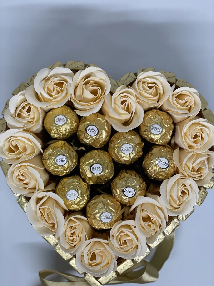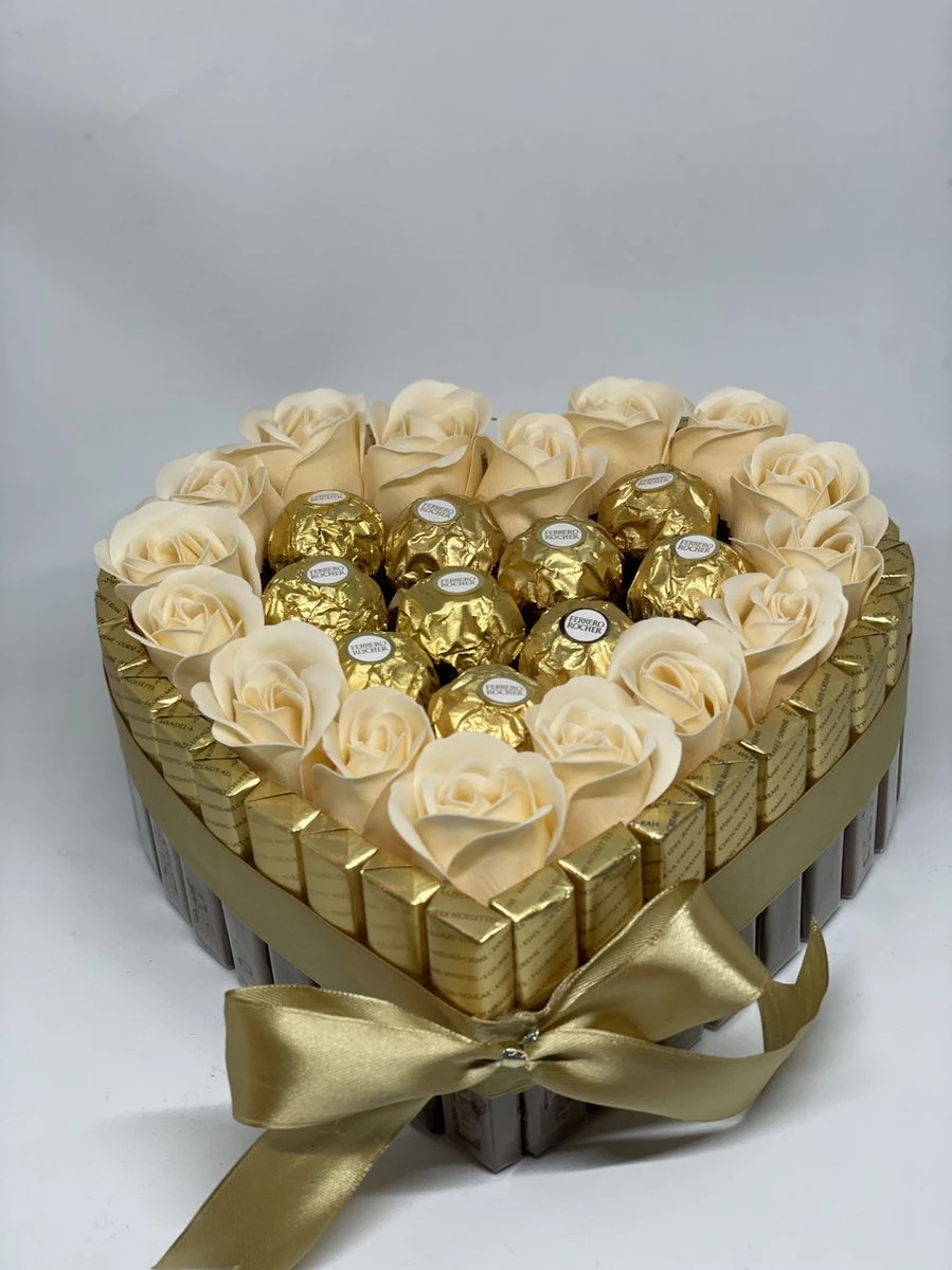 Deze XL chocoladehart is omhuld met merci chocolade. Deze is goed gevuld met Ferrero Rocher chocolade en zeep rozen.