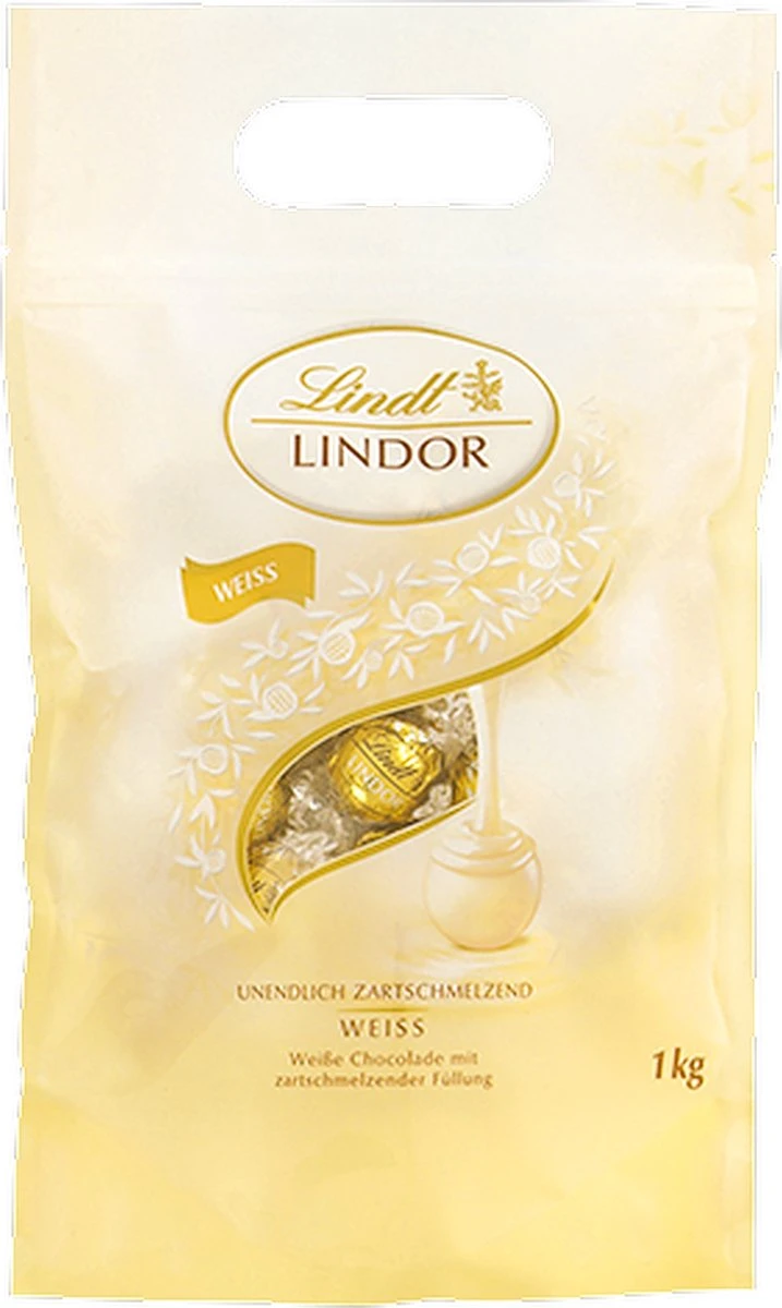 Dit zakje is gevuld met 80 smelt-in-de-mond LINDOR witte balletjes á 12,5 g gemaakt van smelt-in-de-mond witte chocolade.