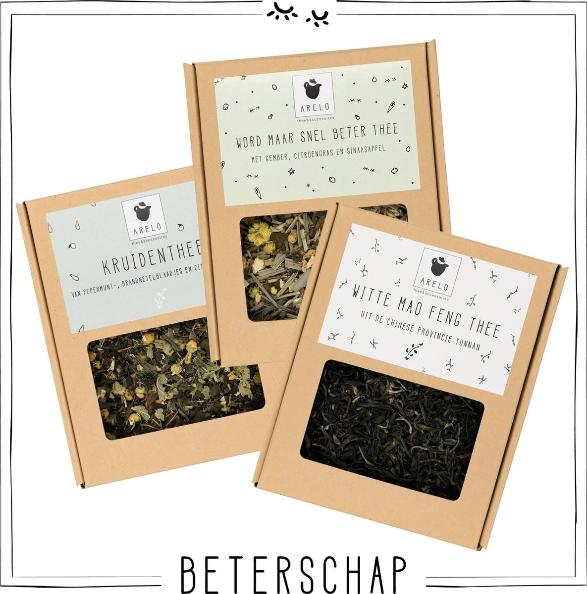 Een pakket met drie soorten theesmaken uit het ARELO assortiment met positieve effecten op de gezondheid.