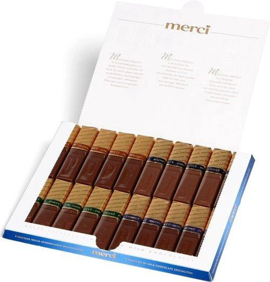 Merci chocolade! Leuk om weg te geven, of gewoon voor jezelf. bevat 20 stuks chocolade, met verschillende smaken. Dat is 250 gram melk chocolade.