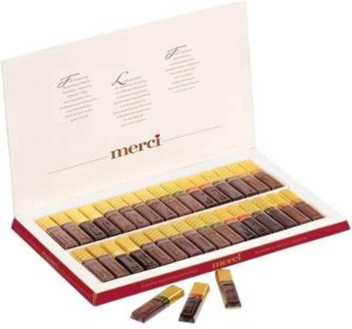 Een heerlijk cadeau om te geven! merci Finest Selection Assorti – 675 gram Melkchocolade, Mokka-room, Amandel-hazelnoot, Hazelnoot-praliné, Marsepein, Pure chocolade, Pure chocolademousse en Melk-praliné. Ingrediënten Ingrediënten: suiker, cacaoboter, cacaomassa, vollemelkpoeder, hazelnoten, plantaardige vetten (palm, shea), roompoeder, amandelen, melksuiker, karnemelkpoeder, weipoeder, botervet, magere cacao, mageremelkpoeder, dextrose, emulgator: lecithine (soja), fructose, koffie, glucosestroop, invertsuikerstroop, aroma’s, zout. Melkchocolade met hazelnootcrèmevulling; melkchocolade: ten minste 32% cacaobestanddelen. Melkchocolade; melkchocolade: ten minste 32% cacaobestanddelen. Melkchocolade met pralinécrèmevulling; melkchocolade: ten minste 32% cacaobestanddelen. Pure chocolade; pure chocolade: ten minste 45% cacaobestanddelen. Pure chocolade gevuld met marsepein; pure chocolade: ten minste 50% cacaobestanddelen. Pure chocolade met moussevulling; pure chocolade: ten minst…