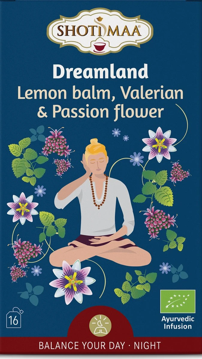 ‘Dreamland’ is een ayurvedische thee op basis van de fijnste biologische kruiden, bloemen en specerijen. Gun jezelf een gezellig moment van warme comfort met passiebloem, citroenmelisse en valeriaan. En dompel jezelf onder in de rustgevende stilte van de nacht.